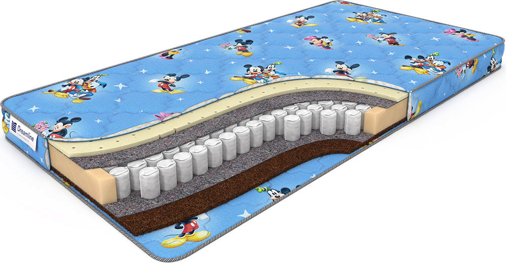 - Сторона А – жёсткий наполнитель из латексированной кокосовой койры способствует сбалансированному распределению веса ребёнка по поверхности и обеспечивает правильное формирование позвоночника.