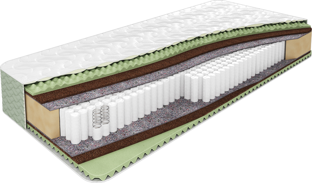 Матрас включает массажную пену ErgoFoam с обеих сторон, что обеспечивает отличную поддержку и расслабление мышц во время сна. Дополнительно, кокосовый слой толщиной 1 см с обеих сторон придаёт матрасу необходимую жесткость и долговечность. Внутри матраса расположен пружинный блок S 1000 с независимыми пружинами, который даёт индивидуальную поддержку для каждого участка тела. Это позволяет избежать точечных нагрузок и способствует правильному положению позвоночника. Чехол матраса выполнен из объемного простеганного трикотажа (ортопена), который придаёт приятные тактильные ощущения и хорошую воздухопроницаемость. Боковина из простеганной ткани букле добавляет элегантности и стиля.