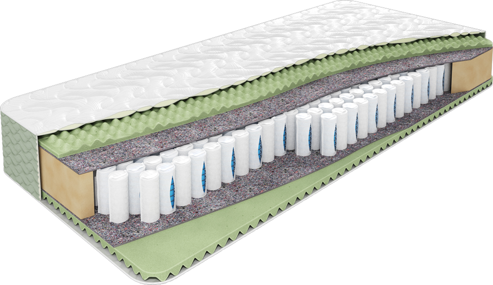 Матрас сочетает инновационную массажную пену ErgoFoam с усиленным пружинным блоком DS (пружина в пружине). Такая конструкция обеспечивает точечную поддержку тела, снимая напряжение с мышц и улучшая кровообращение.