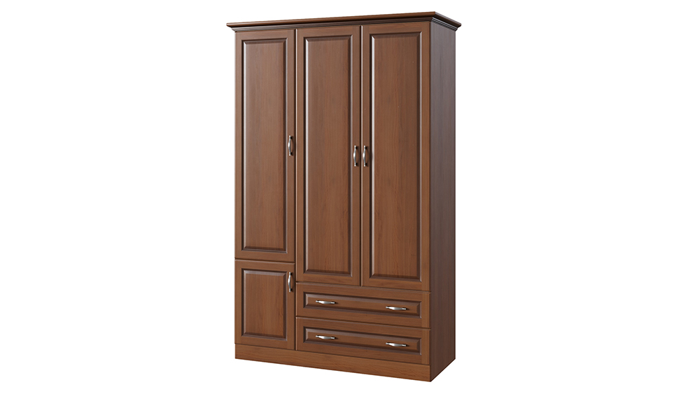 Классический шкаф, созданный в едином стиле с коллекцией Эдем — изделие без которого не возможно себе представить спальню. Корпус шкафа может быть изготовлен как из массива бука и ясеня, так и из массива мягколиственных пород, что делает его стоимость еще более демократичной. Трех створчатый шкаф имеет 3 базовые комплектации: c антресольной секцией в верхней (3-3) или нижней части (3-1) шкафа, или двумя выкатными ящиками (3-2) в нижней части шкафа. Стандартно двух створчатая секция шкафа располагается в правой части шкафа. Фасады шкафа могут иметь встроенные зеркала, как на лицевой части фасада — по размеру филенчатой части, так и на внутренней стороне фасада. Распашные дверцы шкафа оснащены петлями с системой до-закрытия в базовой комплектации. В большей секции шкафа предусмотрена штанга для плечиков, а в малой секции предусмотрены 3 полки для хранения вещей. По желанию шкаф может быть оснащен любым количеством полок.