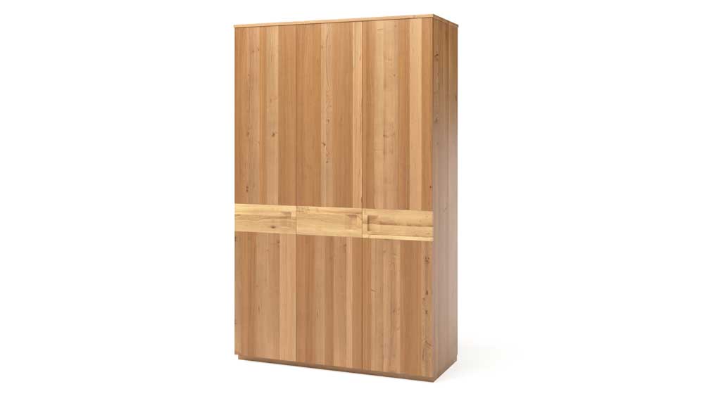 Шкаф Сен-Реми состоит из двух зон. За левой дверью находится пространство с четырьмя полками для размещения небольших вещей. За двумя дверями располагается антресоль, хромированная штанга для вешалок, полка и выдвижной ящик с отверстиями в качестве ручек. Под ящиком остается место для обуви. Мебель изготовили из массива бука — благородной породы дерева, которая не боится нагрузок, не крошится и не трескается. Украшает фасад ярко выраженный рисунок среза ствола бука и фрезеровка под ручки, выделенная контрастной вставкой из массива. Внутренние детали шкафа (перегородки, вкладные полки, несущие полки ) изготавливаются из сращенного щита мягколиственнных пород древесины. Габаритные размеры шкафа (Ш х Г х В): 134,5×58×220 см.