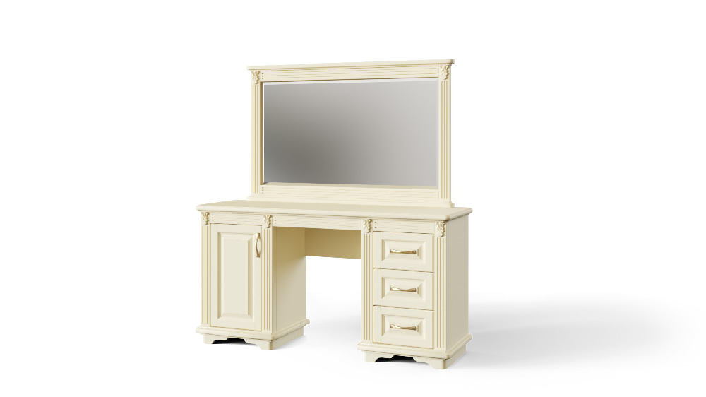Стол для косметических принадлежностей, украшений, аксессуаров и различных приятных мелочей — Палермо ЭЛИТ, функциональное пространство для личных целей. Единое дизайнерское решение элементов декора, четко выверенные пропорции и безупречнеая функциональность! Все это создают: полноразмерное зеркало с вариантами крепления к стене или к столешнице туалетного стола, 3- выкатных ящика, 1 ниша с распашной дверцей и 1 потайной ящик под столешницей. Высококачественная ручная отделка столика Палермо, как и всей остальной мебели серии Палермо, в полной мере передает любовь и теплоту с которой мастера DreamLine создают мебель. Сборка не требуется.