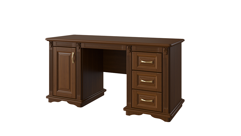 Стол руководителя Палермо - Новинка в коллекции мебели для спален от фабрики DreamLine. Стандартно, данная модель изготавливается с тумбовой частью с распашной дверью, за которой внутренняя секция разделена на две равные доли полкой - одна сторона, другая сторона (тумбовая часть) - с тремя выкатными ящиками. Сборка не требуется.