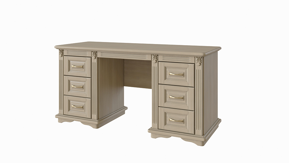 Стол руководителя Палермо - Новинка в коллекции мебели для спален от фабрики DreamLine. Стандартно, данная модель изготавливается с тумбовой частью с распашной дверью, за которой внутренняя секция разделена на две равные доли полкой - одна сторона, другая сторона (тумбовая часть) - с тремя выкатными ящиками.