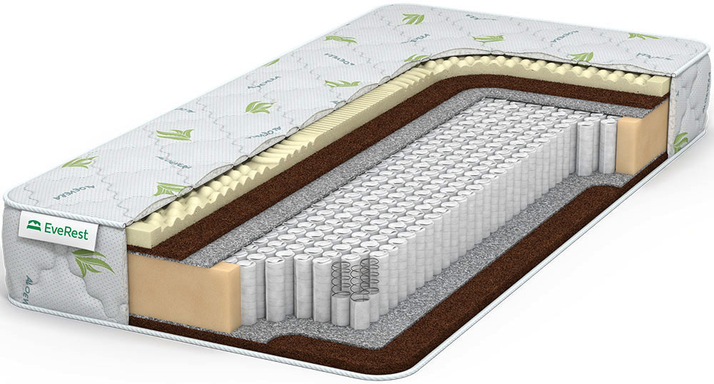 Пружинный матрас с двумя видами наполнителя: койры и латекса, обеспечивающих разностороннюю жесткость спальных поверхностей. Основа модели — блок MultiPocket из адаптивных микропружин (500 пр./кв.м). Средняя жесткость включает кокосовую койру, поверх которой уложен мягкий рельефный латекс с легким массажным эффектом. Жесткость второй стороны обеспечен одним настилом койры двухсантиметровой толщины. За счет такого наполнителя нагрузка равномерно распределена по спальной поверхности. Трикотажный чехол защищен от бактерий составом Aloe Vera.